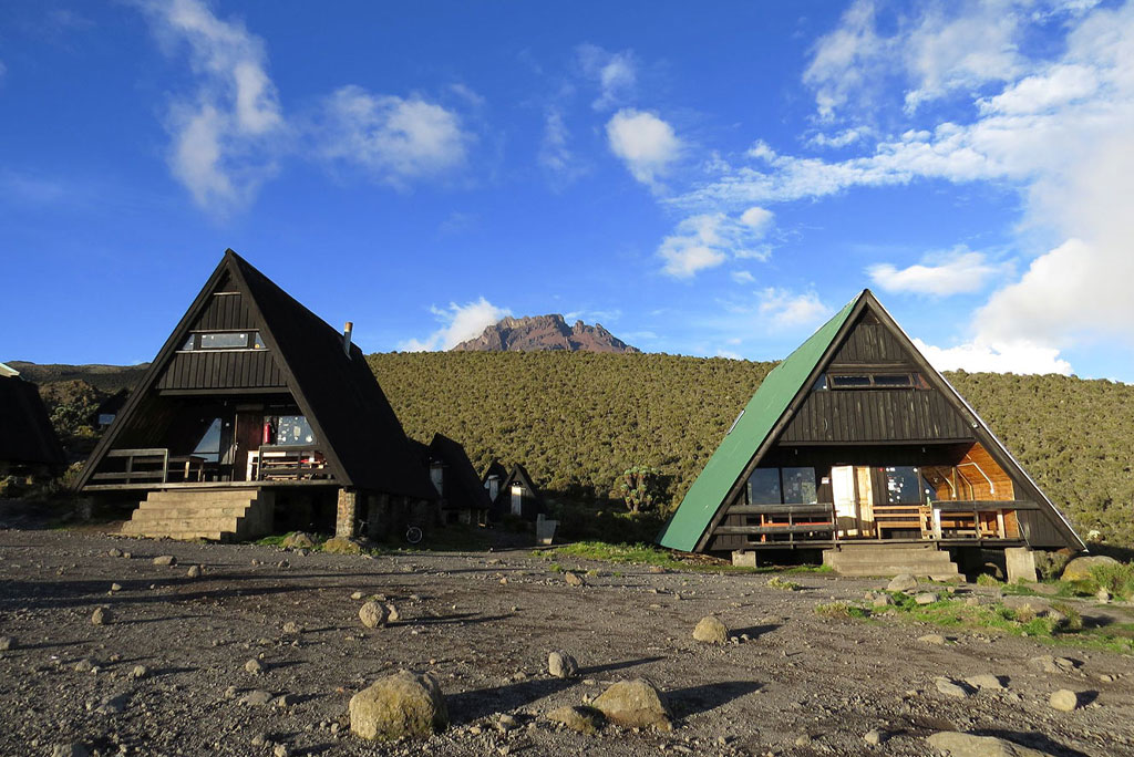 The Marangu route, also known as the “Coca-Cola” route, is the oldest, most well established route on Kilimanjaro. This is the only route which offers sleeping huts in dormitory style accommodations in lieu of camping. There are 60 bunk beds each at Mandara and Kibo Huts, and 120 bunk beds at Horombo Hut. Guests are supplied with mattresses and pillows, but sleeping bags are still required. The huts have communal dining halls and basic washrooms, ranging from flushing toilets and running water at the lower huts to long drop toilets and buckets of water at Kibo Hut.